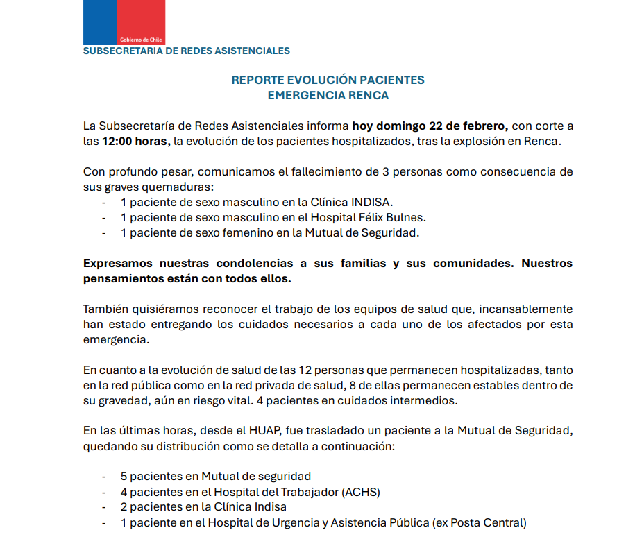 Este domingo la Subsecretaría de Redes Asistenciales confirmó a tres nuevos fallecidos producto de la grave tragedia en Renca.