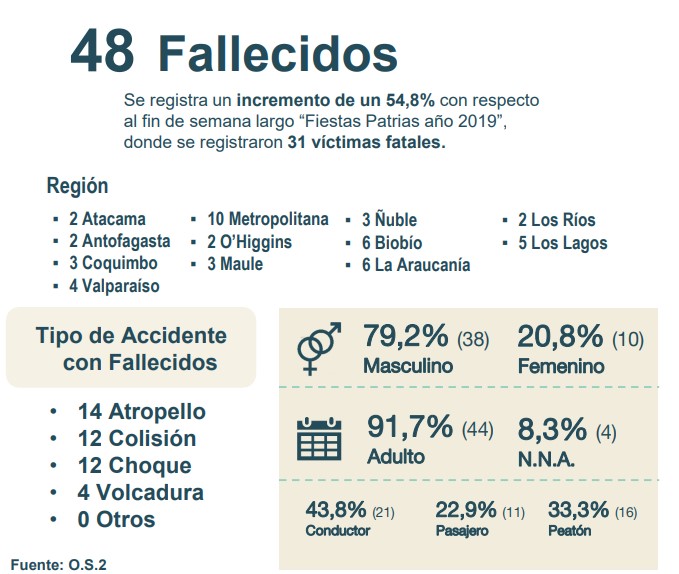 Esto implica un incremento de un 54,8% con respecto al fin de semana largo “Fiestas Patrias año 2019”, donde se registraron 31 víctimas fatales.