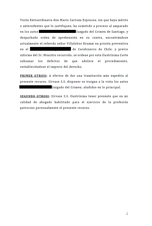 Justifica el recursos señalando que Carroza "sin que haya mérito o antecedentes que lo justifiquen, ha sometido a proceso al amparado en el Juzgado del Crimen de Santiago, y despachado orden de aprehensión en su contra, encontrándose actualmente el señor Villalobos Krumm en prisión preventiva".