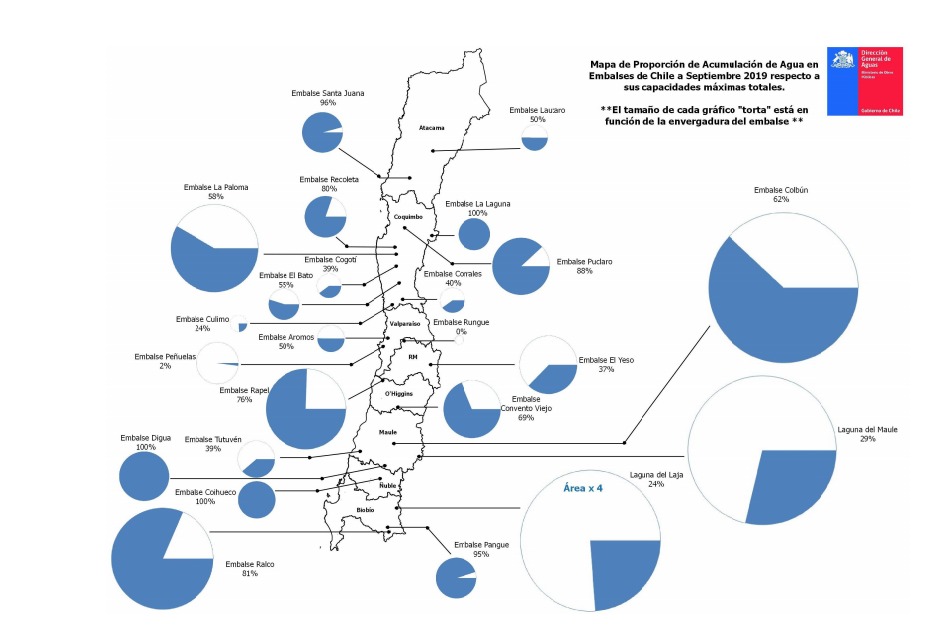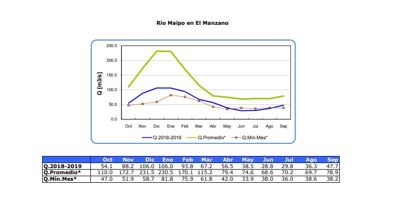 En cuanto al caudal del río Maipo, que abastece cerca del 80% del consumo de agua potable en la capital, en el sector El Manzano se registraron 47,7 metros cúbicos por segundo en septiembre, muy por debajo de su promedio histórico para el mes que alcanza 78,9 metros cúbicos por segundo.