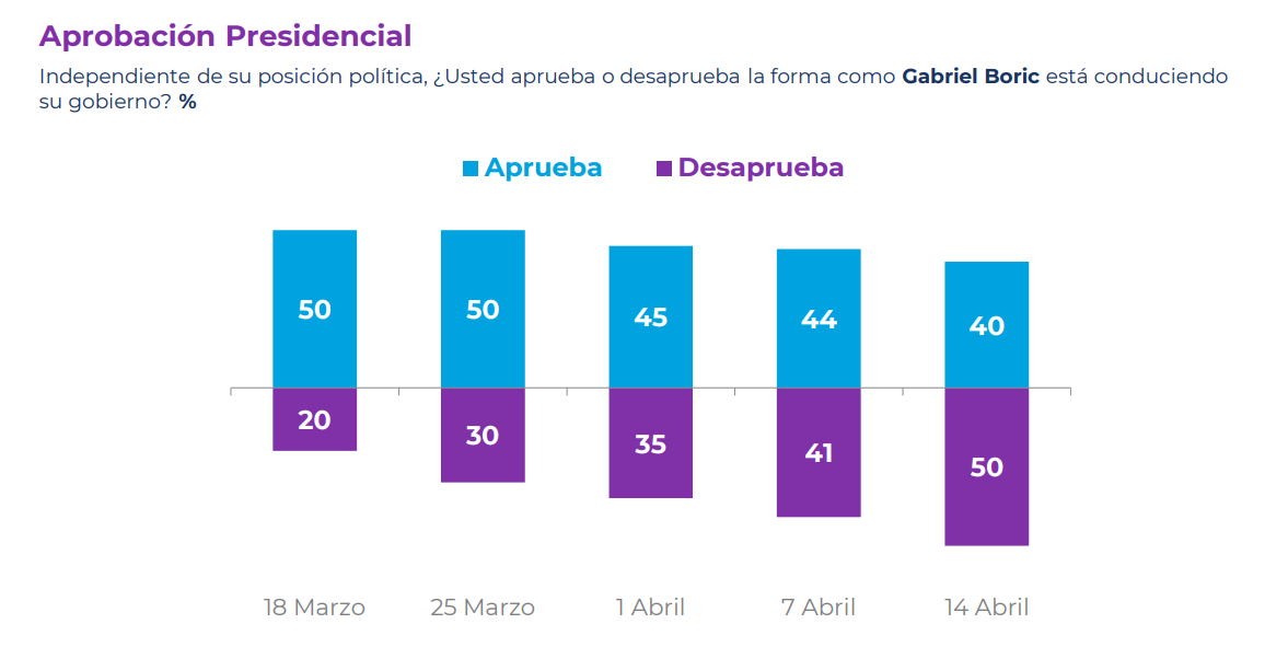 La encuesta reflejó que dicho ítem tuvo un crecimiento de 30 puntos desde el 20 de marzo, fecha en que se dio a conocer la primera encuesta con Boric como jefe de Estado, aunque en esa ocasión llevaba solamente una semana como líder del Ejecutivo.