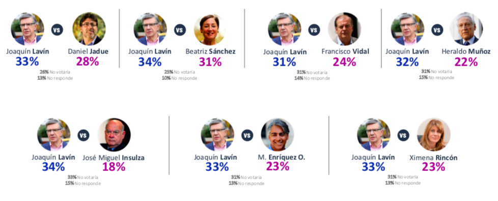 El sondeo, publicado este lunes, muestra que el candidato más competitivo sería Lavín, quien al enfrentarse a Jadue le saca una delantera de 33% vs 28%. Algo similar ocurre con la ex candidata del Frente Amplio, Beatriz Sánchez (34% vs 31%).