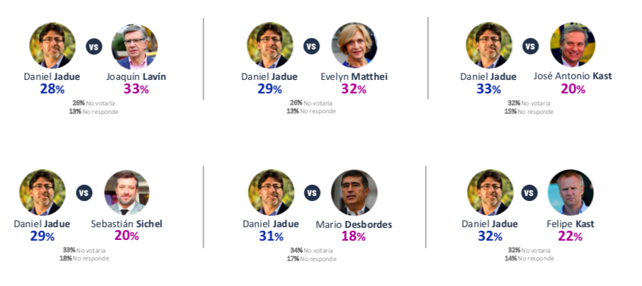 Por su parte, Jadue se impone frente a todos los candidatos de derecha, excepto ante Lavín y la alcaldesa de Providencia, Evelyn Matthei (29% vs 32%).