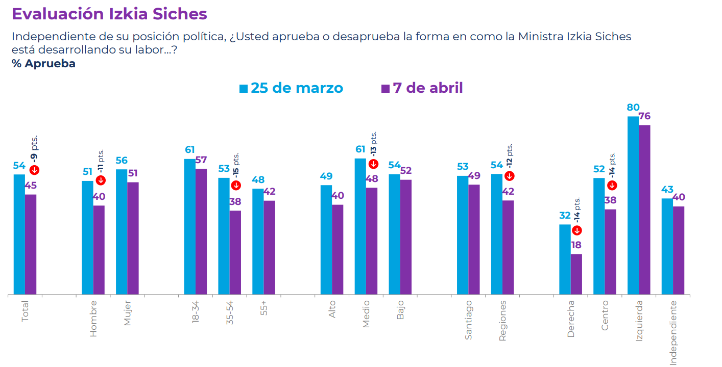 Ante la pregunta: “¿Usted aprueba o desaprueba la forma en cómo la ministra Siches está desarrollando su labor?”, solamente el 45% respalda la gestión de la secretaria de Estado, cifra que es nueve puntos menor a la del 25 de marzo.