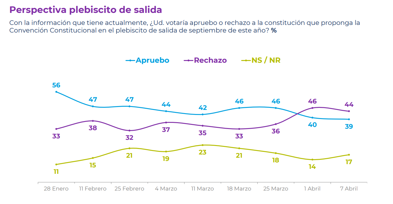 Según Cadem, la opción Rechazo tuvo una leve disminución de 2 puntos (44%) esta semana, pero igual superaría levemente al Apruebo, alternativa que alcanzó un 39%.