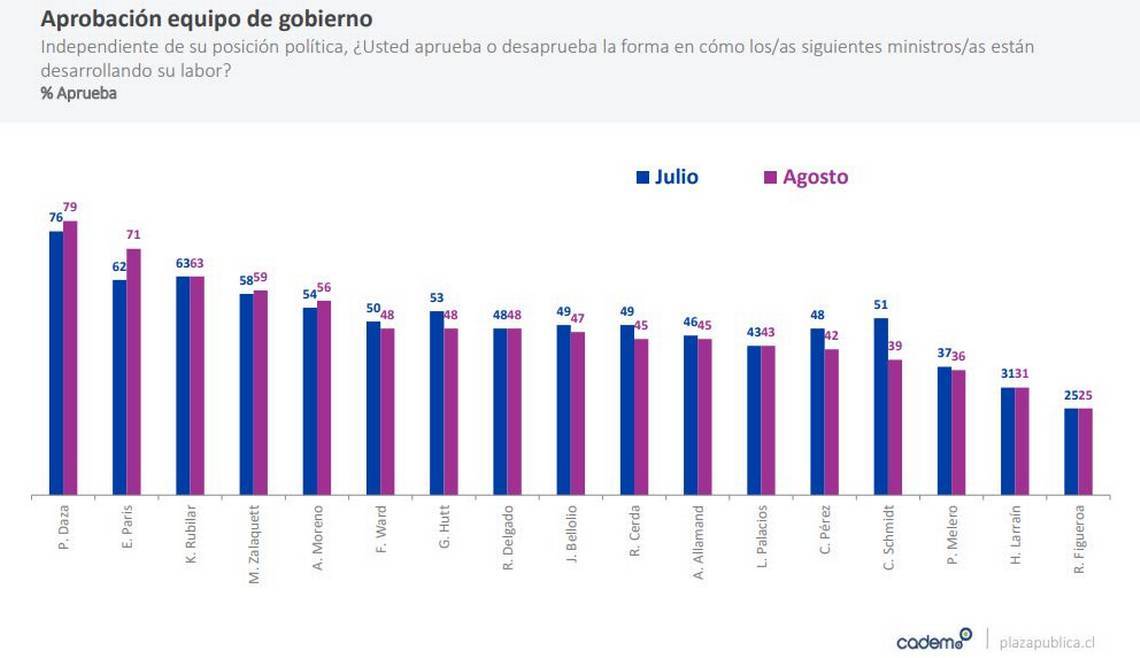 De acuerdo al sondeo, Daza recibió la mayor cantidad de adhesión ante la pregunta "independiente de su posición política, ¿usted aprueba o desaprueba la forma en cómo los/as siguientes ministros/as están desarrollando su labor?", marcando un 79% de aprobación.