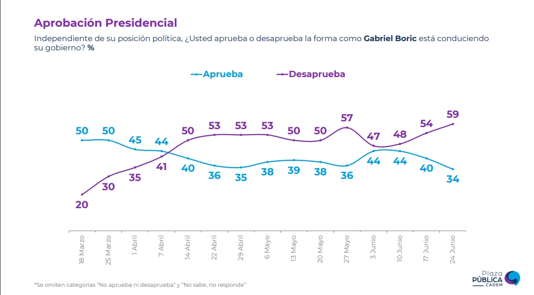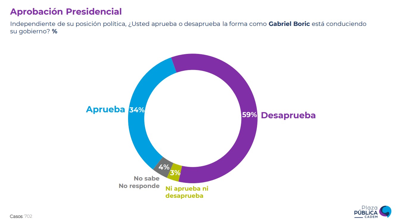 Este domingo 26 de junio, la encuesta Plaza Pública Cadem, correspondiente a la cuarta semana de junio, entregó la evaluación ciudadana a la gestión del presidente de la República, Gabriel Boric.
