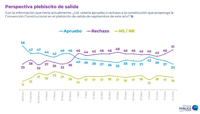 En concreto, la opción Apruebo obtuvo un 33%, disminuyendo 4 puntos respecto al sondeo anterior. En tanto, el Rechazo tuvo un aumento de cinco puntos, posicionándose en 51%.