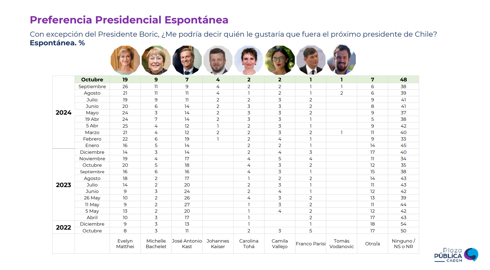 Le siguen José Antonio Kast (7), Johannes Kaiser (4) y las ministras Carolina Tohá y Camila Vallejo, ambas con 2% de las preferencias.