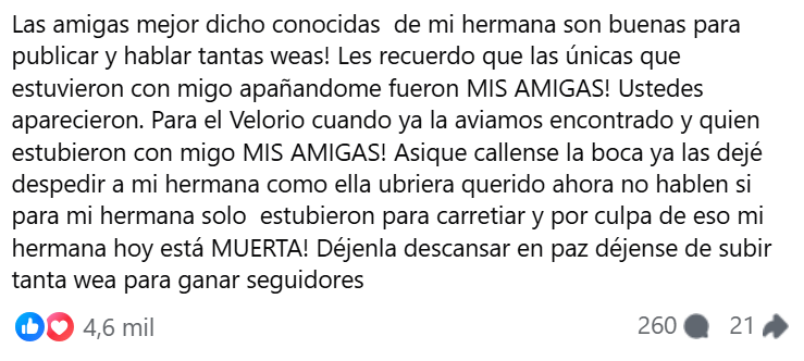 "Para mi hermana solo estuvieron para carretear y por culpa de eso mi hermana hoy ¡ESTÁ MUERTA!", escribió Cristal, quien criticó el actuar de las amigas de Krishna durante el último mes y en los actos fúnebres.