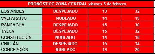 Mientras el calor sofoca el centro-sur del país, Santiago se mantendrá con temperaturas máximas a la baja durante el primer fin de semana de febrero. Además, regresará la opción de precipitaciones a la cordillera de Los Andes en la zona central. En las playas centrales se mantiene la tendencia con abundante nubosidad, incluso nieblas, y algo de sol recién por las tardes.