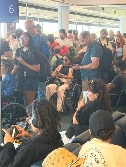 La información fue entregada por La Hora, quienes señalaron que la fotografía fue tomada este lunes en la fila de embarque del Aeropuerto de Santiago.