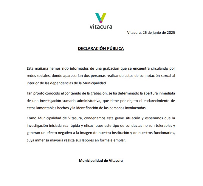 El organismo anunció que “esta mañana hemos sido informados de una grabación que se encuentra circulando por redes sociales, donde aparecerían dos personas realizando actos de connotación sexual al interior de las dependencias de la Municipalidad”.