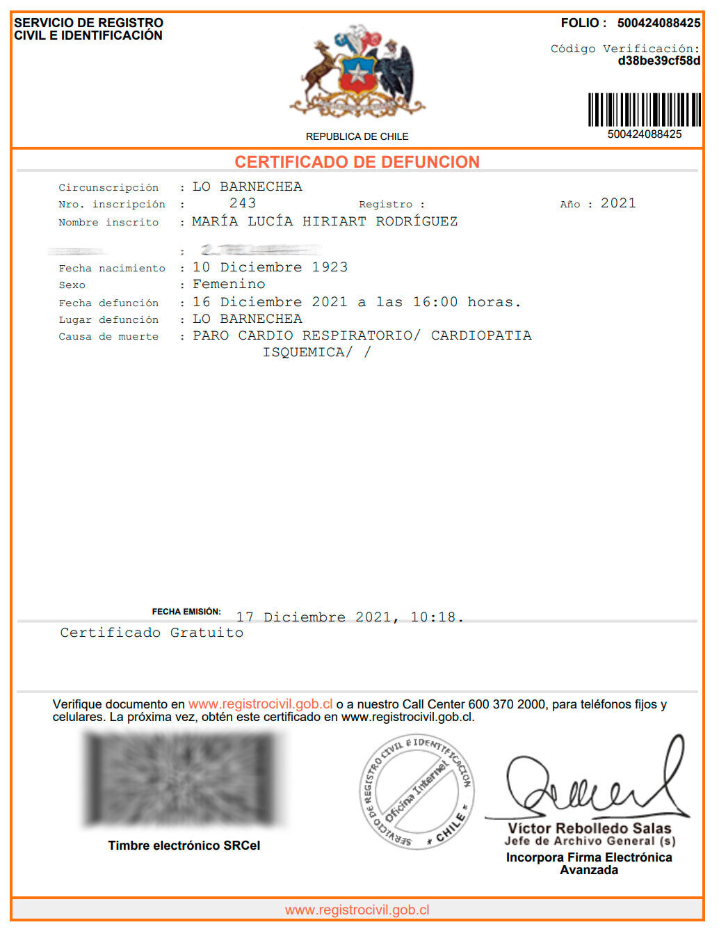 El certificado revela que la causa de muerte fue un "paro cardio respiratorio / cardiopatía isquémica" y que murió a las 16:00 horas del 16 de diciembre de 2021 en Lo Barnechea.