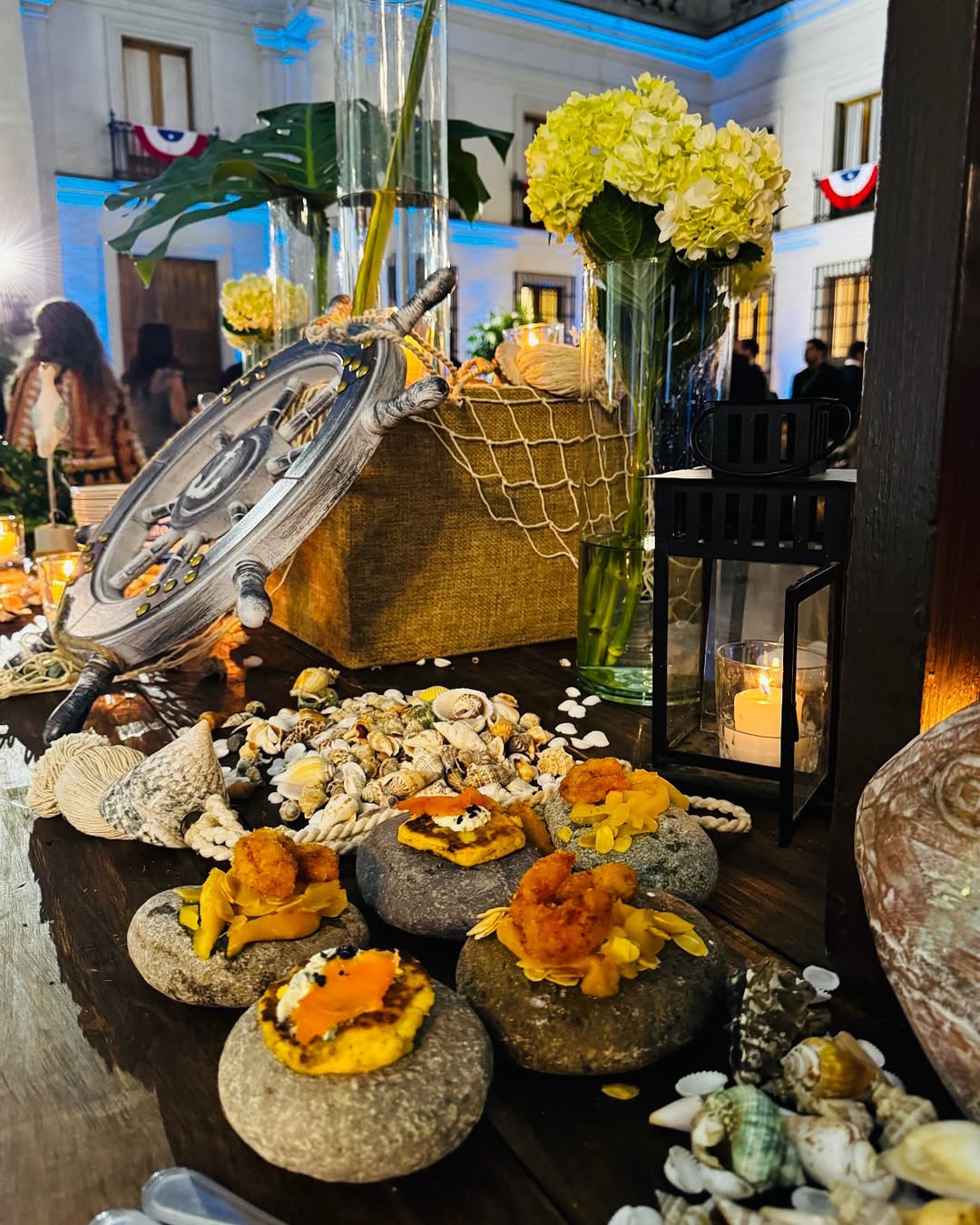 Estaciones de comida con ceviches y mariscos, además de una variedad de picoteos disfrutados por los invitados.