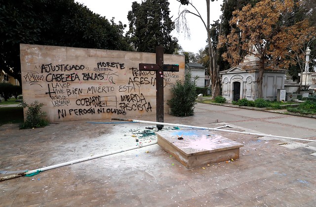 Parlamentarios y ministros de Estado condenaron el atentado que afectó la tumba del fundador de la UDI en el Cementerio General, por parte de un grupo de desconocidos.