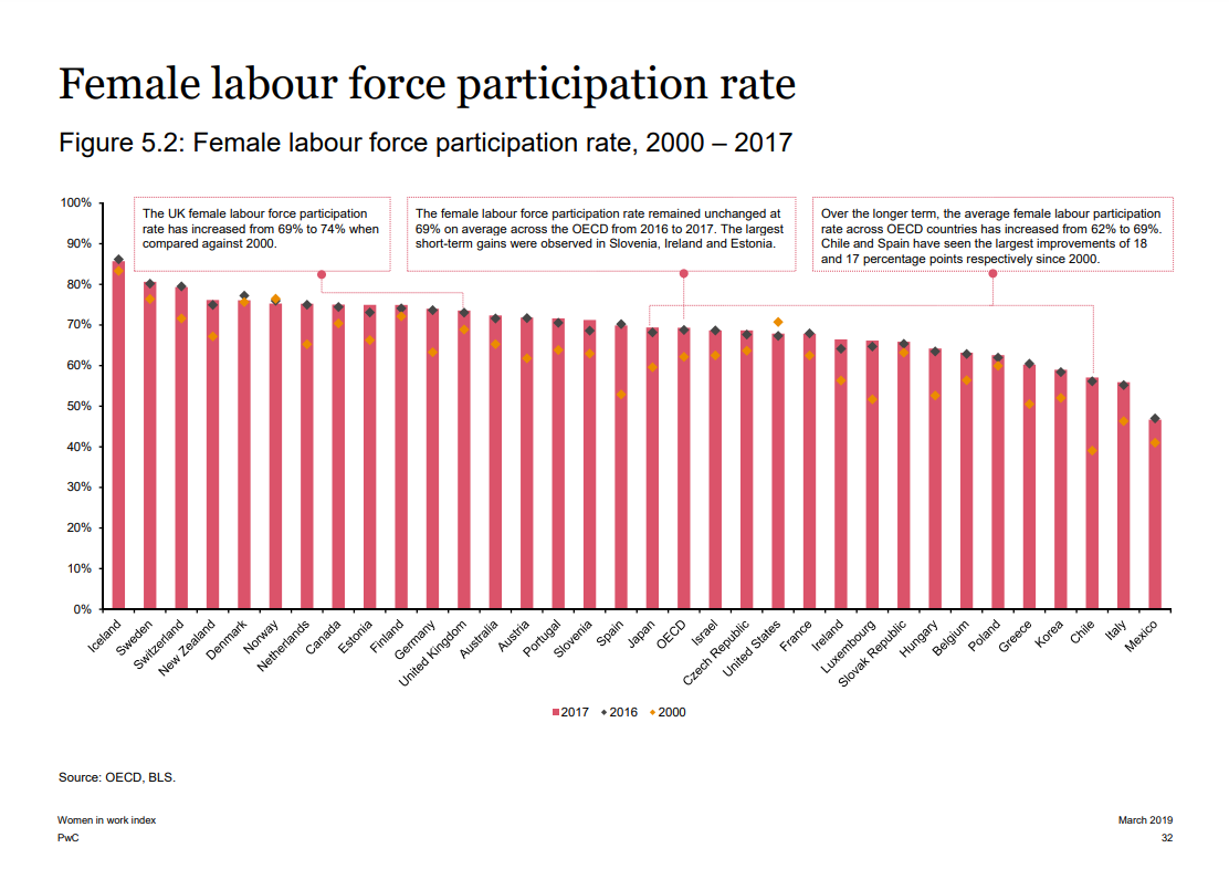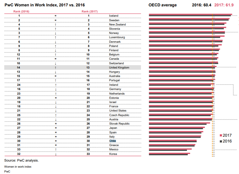 El documento aborda aspectos como como la brecha salarial por género y la tasa de participación femenina en la fuerza laboral, y situó al país en los últimos lugares, en el puesto número 30, sólo por encima de Grecia, México y Corea. De este modo, en 2017 no experimentó ninguna variación con respecto a 2016.