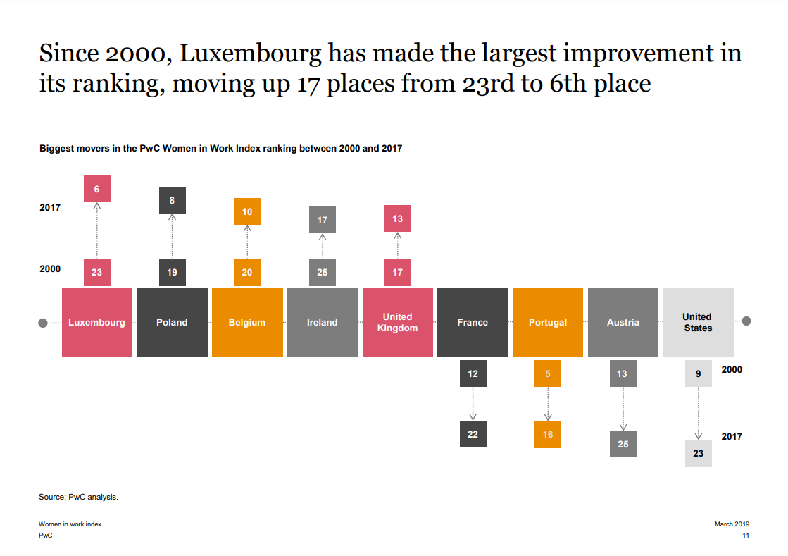 Finalmente, el informe destaca a Luxemburgo, Polonia, Bélgica, Irlanda y Reino Unido como los países que han experimentado las mayores mejoras en torno al tema, mientras que Francia, Portugal, Austria y Estados Unidos expresan las principales caídas.