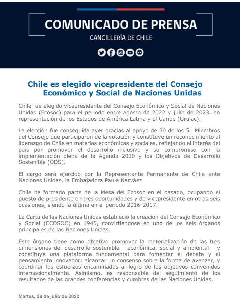 Chile resultó electo para la vicepresidencia luego de recibir el apoyo de 30 de los 52 miembros del Consejo que participaron de la votación. Algo que, según el Ministerio, “constituye un reconocimiento al liderazgo en materias económicas y sociales, reflejando el interés del país por promover el desarrollo inclusivo”.