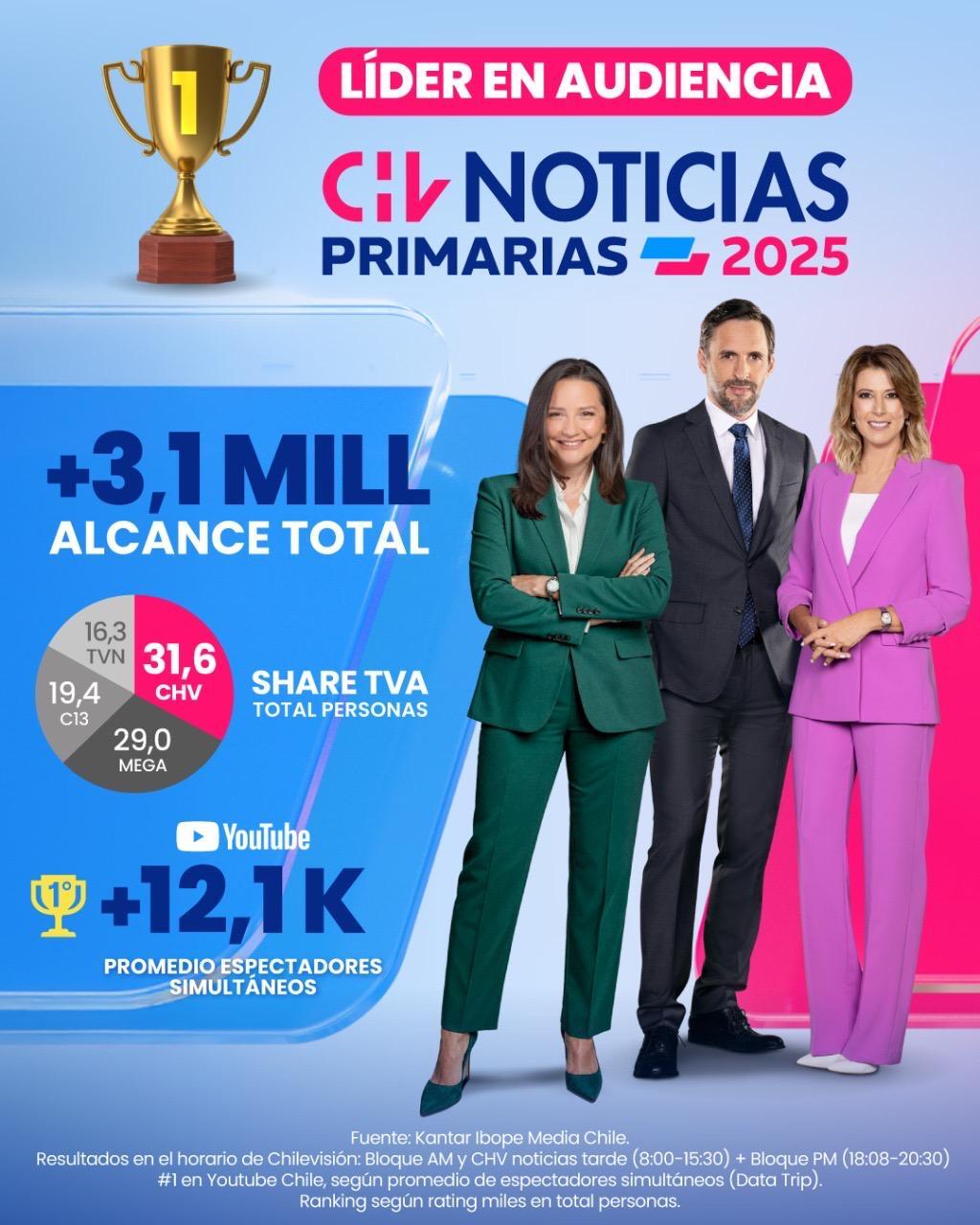 Esto, si se considera la audiencia promedio del bloque CHV Noticias Primarias 2025 AM más CHV Noticias Tarde (8:00-15:30), sumado al bloque CHV Noticias Primarias 2025 PM (18:08-20:30).