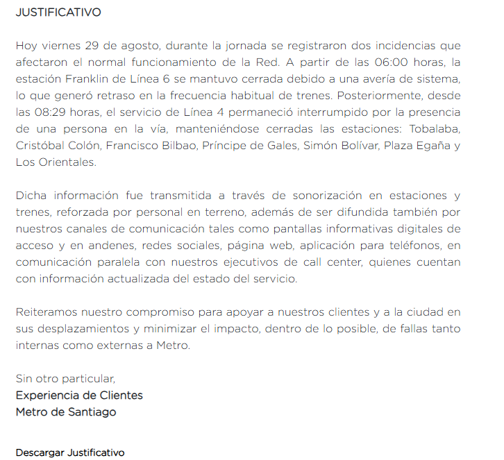 Tras el cierre de estaciones y el retraso en los tiempos de viaje, Metro puso a disposición un justificativo para los usuarios que hayan visto afectados sus horarios.