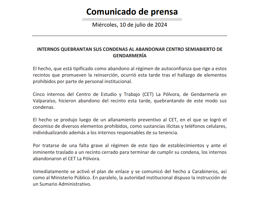 A través de un comunicado de Gendarmería, se informó que el hecho ocurrió en el régimen de autoconfianza que rige a estos recintos que promueven la reinserción.