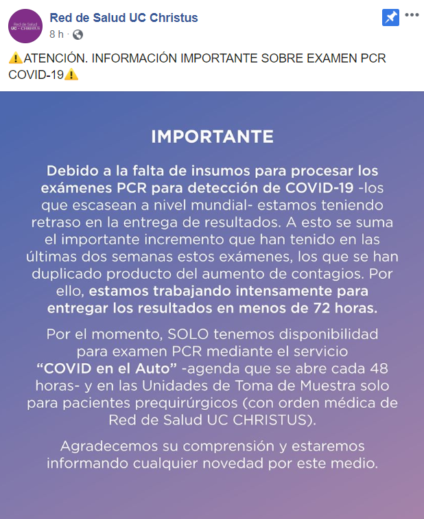 La Red de Salud UC Christus también denunció una "falta de insumos para procesar los exámenes PCR para detección de COVID-19 -los que escasean a nivel mundial- estamos teniendo retraso en la entrega de resultados".