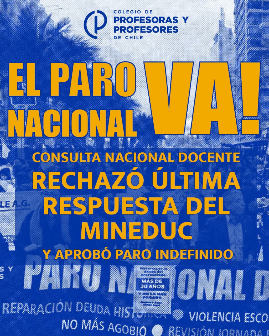 El Colegio de Profesores confirmó que llamarán a un paro nacional indefinido tras mostrarse inconformes con las negociaciones con el Ministerio de Educación. Tras una consulta nacional para decidir si aceptaban o no la propuesta del Mineduc, las autoridades del gremio anunciaron que un 53,6% votó rechazar las medidas negociadas, mientras que un 46,3% decidió aceptar. En la consulta participaron 54.508 personas y la convocatoria a paro incluye a todos los colegios municipales del país, aunque también se podrían sumar establecimientos particulares subvencionados. El anuncio fue encabezado por el presidente del gremioCarlos Díaz, quien detalló que la movilización comenzará este martes 29 de agosto, desde las 07:00 horas. “Este paro indefinido es la respuesta que las profesores y los profesores de Chile dan frente a un gobierno que cada vez más nos va entregando, con cuentagotas, las respuestas que va dando, que no son satisfactorias, que no van en la línea que venimos señalando hace mucho tiempo”, expresó Díaz Los docentes tienen un petitorio que aborda al menos ocho puntos importantes. Entre ellos un plan para enfrentar la violencia escolar, la preocupación por la deuda histórica, y el pago de los bonos de retiro atrasados. Además, solicitan mejorar los Servicios Locales de Educación Pública (SLEP), poner fin al agobio laboral docente, cambiar el modelo de financiamiento de la educación, revisar la jornada escolar completa y pagar la mención a docentes diferenciales y de párvulos. Recordemos que durante este año ya hubo una jornada de paro y, posteriormente, fueron dos días consecutivos de huelga, todo esto en medio de la salida del ahora ex ministro de Educación, Marco Antonio Ávila.