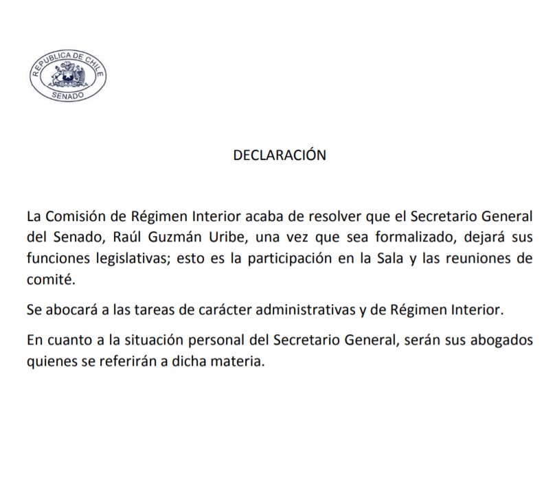 Lee también: Secretario del Senado recibe multa de $2,5 millones tras polémica visita a restaurante en San MiguelLos hechos ocurridos el 25 de junio fueron vistos por el Ministerio Público, algo esperado por la Comisión de Régimen Interno del Senado para pronunciarse al respecto.