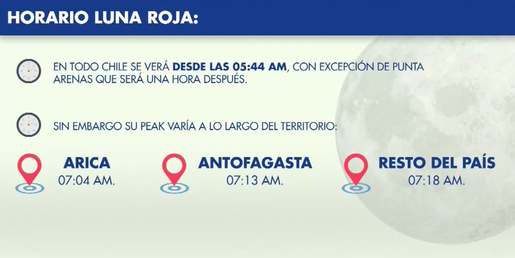 En tanto, la divulgadora del Centro de Astrofísica, Bernardita Ried, detalló que "esta Luna de Sangre no es nada más y nada menos que un eclipse lunar, que es cuando el Sol se alinea con la Tierra y la Luna, de tal manera que la Tierra proyecta una sombra sobre la Luna. Sin embargo, en vez de verla oscura, como uno pensaría, lo que pasa es que nuestra Tierra tiene una atmósfera alrededor y esa atmósfera de alguna forma desvía los rayos rojos”.