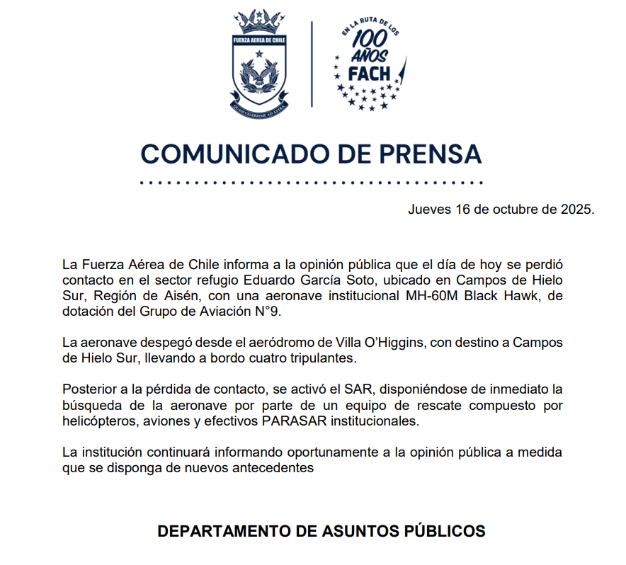 Este jueves por la noche, la Fuerza Aérea de Chile informó que durante esta jornada se perdió contacto en el sector refugio Eduardo García Soto, ubicado en Campos de Hielo Sur, Región de Aisén, con una aeronave institucional MH-60M Black Hawk, de dotación del Grupo de Aviación N°9 y donde viajaban cuatro tripulantes.