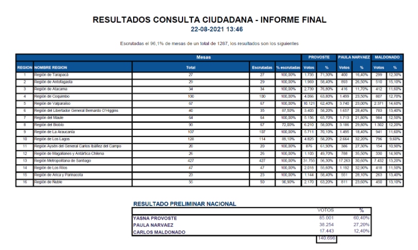Con un 96,1% de las mesas escrutadas (de un total de 1.287), Provoste obtuvo la mayoría de las preferencias, alcanzando un 60,4% que corresponde a 85.001 votos.