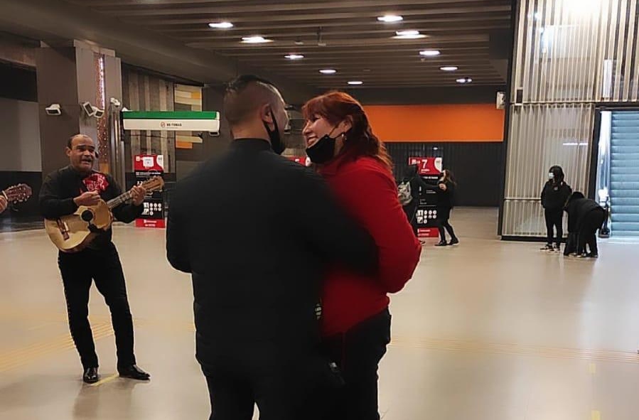 A través de Twitter, la compañía publicó un video donde se ve a Camilo Cancino, vigilante de la Línea 5, y Bárbara Inalaf, quien se desempeña como guardia de seguridad, abrazados mientras un grupo de mariachis tocan la canción Si nos dejan.