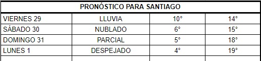 Este viernes (29 de mayo) y durante parte del sábado (30 de mayo), la capital podría recibir chubascos por sectores y por momentos. Según el meteorólogo de Chilevisión, Eduardo Sáez, “los análisis que he realizado entregan un promedio de 1 o 2 milímetros en el valle de Santiago. Lo más cuantioso se presentará en lugares de la precordillera. Pero, aclaro que, al ser una baja segregada, el margen de error en el pronóstico es más amplio, porque este es un fenómeno dinámico y muy cambiante”.