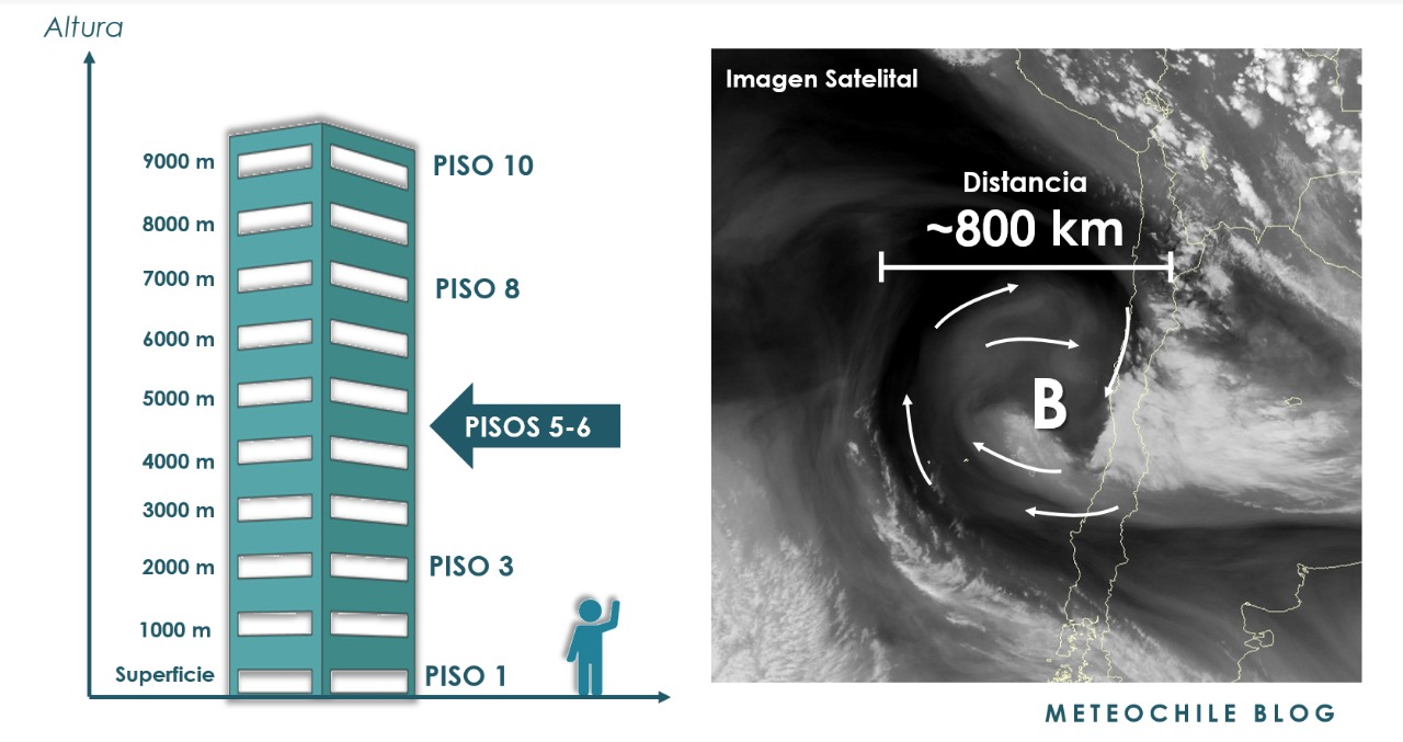 “Estos fenómenos son capaces de generar fuertes corrientes de aire entre los pisos altos y bajos de nuestro hipotético edificio. Ese movimiento vertical de aire es una de las principales características de las bajas segregadas y es lo que permite la formación de nubes de tormenta que son capaces de crecer a todo lo alto del edificio atmosférico”, indica la Dirección Meteorológica de Chile.