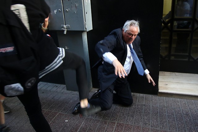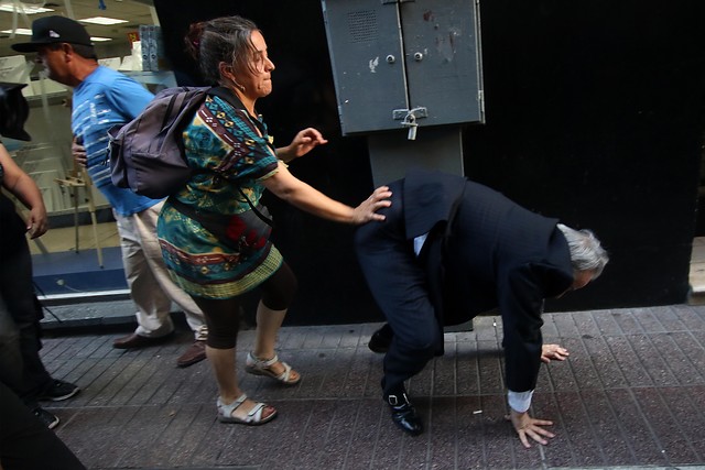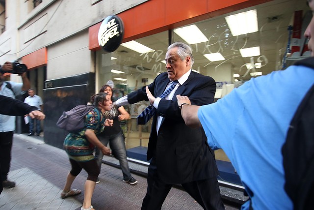 Patadas, combos e insultos, De todo recibió el pasado miércoles el presidente del Tribunal Constitucional (TC), Iván Aróstica, por parte de un grupo de manifestantes contrarios a la discusión al interior del organismo, para declarar inconstitucional las nuevas exigencias que condenados por crímenes de DD.HH. deberán cumplir para acceder al beneficio de la libertad condicional.