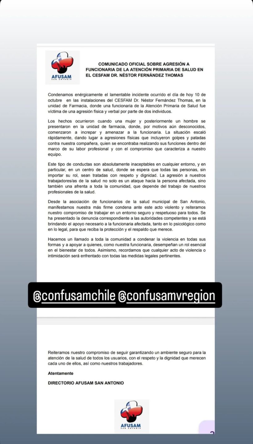 Finalmente, la Municipalidad de San Antonio también condenó los hechos y expresó en redes sociales: "La municipalidad ha dispuesto todas las acciones legales necesarias para respaldar a la trabajadora afectada y colabora con la justicia para que los responsables enfrenten las sanciones correspondientes".