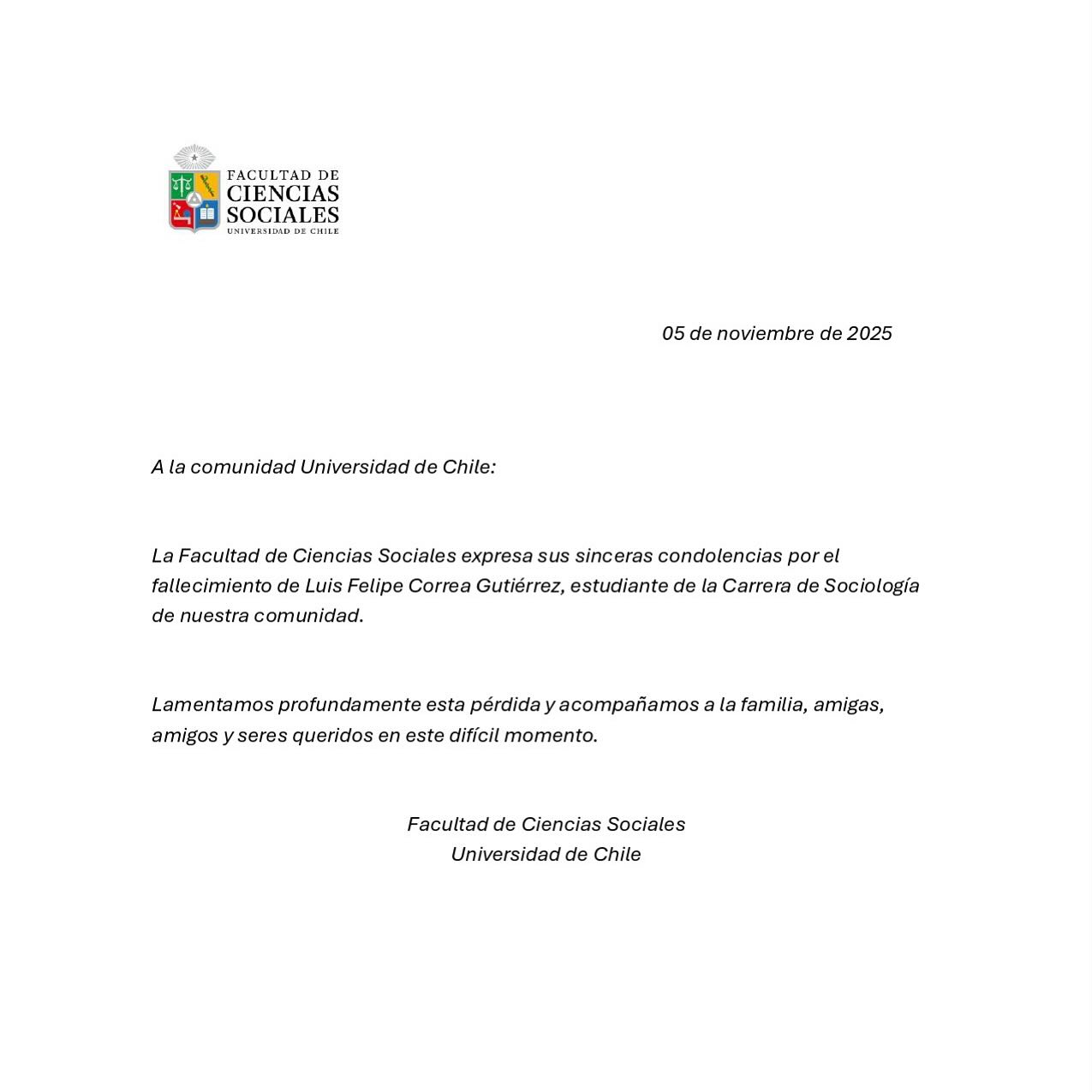 “La Facultad de Ciencias Sociales de la Universidad de Chile informa sobre el fallecimiento de Luis Felipe Correa Gutiérrez, estudiante de la carrera de Sociología de nuestra comunidad”, detallaron en Instagram.