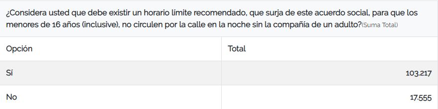 De acuerdo con los resultados publicados, 103.217 personas de las ocho comunas participantes señalaron estar a favor de restringir el horario a menores en las calles.