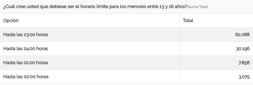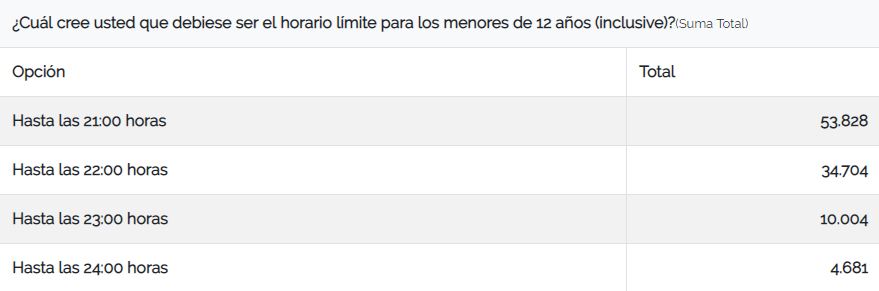 En detalle, más de la mitad de los votantes consideraron que las 21 horas es el horario límite para menores de 12 años. Le siguen 22:00 horas con 34 mil votos; 23:00 horas con 10 mil; y finalmente 4 mil personas optaron por la media noche.