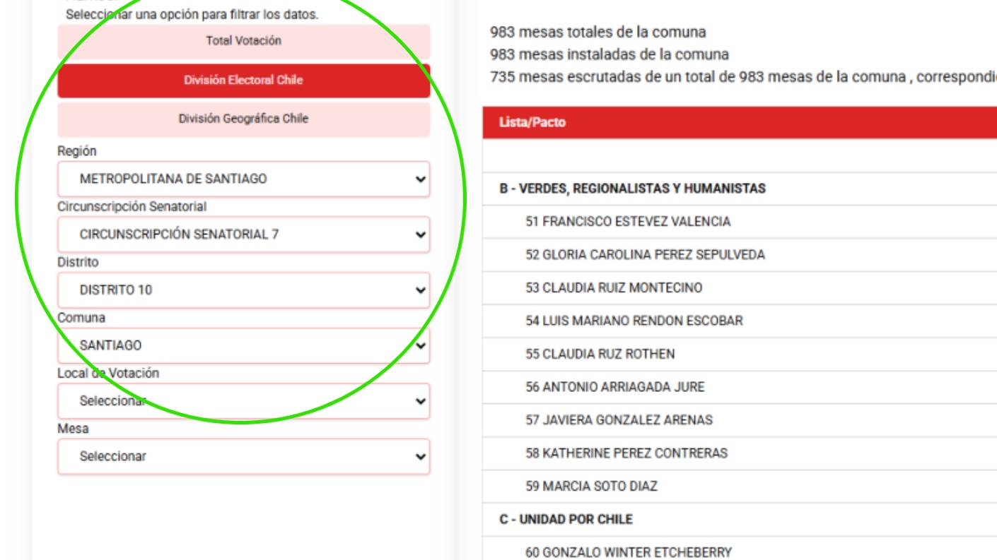 Para revisar el detalle de cada comuna en cada región en las votaciones, ya sea para Presidente/a de la República, Senado y Cámara de Diputados, debes pinchar el siguiente enlace del Servicio Electoral.