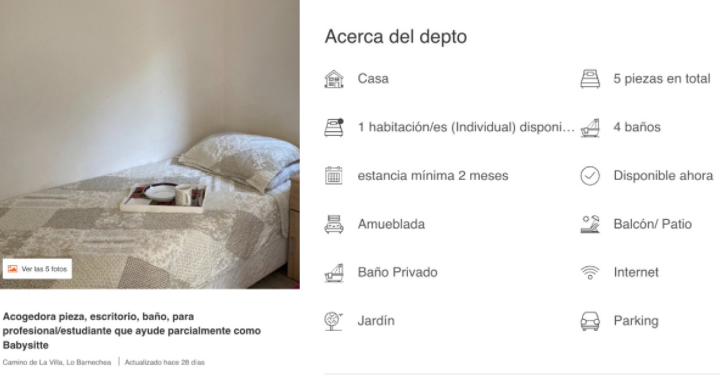 En específico, el arriendo en cuestión es en el sector El Radal de Lo Barnechea, y ofrece una pieza por el pago de $125.000, además de trabajos asociados a labores domésticas y el cuidado de niños.