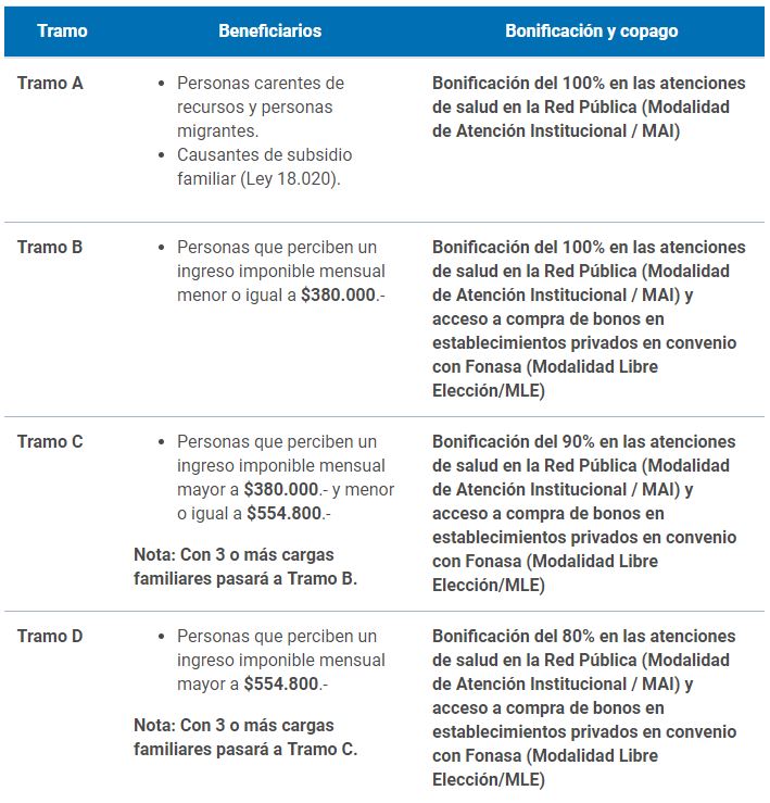 Tras el anuncio, a muchas personas se les generó la duda del tramo al que pertenecen, los que se dividen en A, B, C y D. Estos son establecidos cada año, según las variaciones del ingreso mínimo, e incluye a todos quienes vivan en Chile, independiente de edad, sexo, género, nivel de ingresos, cargas familiares, enfermedades preexistentes y nacionalidad de origen.