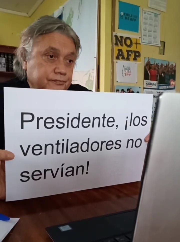 El senador Alejandro Navarro (PRO) también tuvo su intervención, sosteniendo una hoja en la que se leía "Presidente, ¡los ventiladores no servían!", en relación a la polémica de los equipos donados por la CPC y que a la fecha se encuentran inoperativos.
