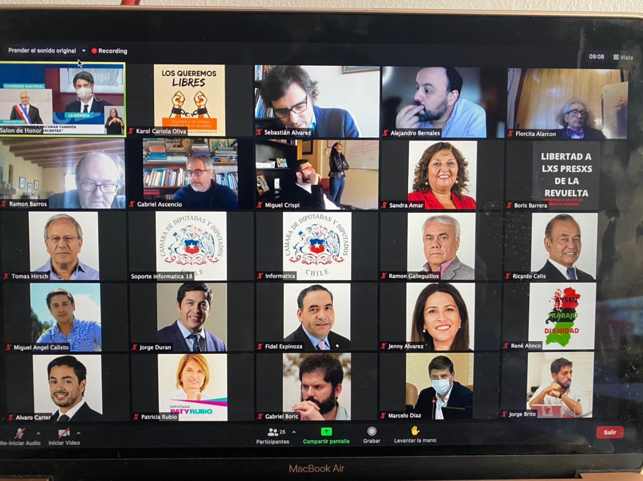La diputada Camila Vallejo (PC), en tanto, mantuvo una imagen de fondo en la que se leía "Libertad a lxs presxs de la revuelta".