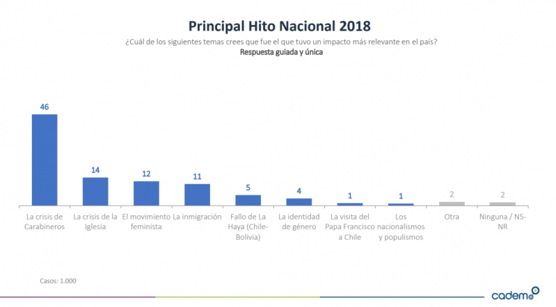 Sin duda, el hecho que tuvo un impacto más importante en la opinión pública fue la crisis de atravesó Carabineros, según un 46% de los encuestados lo aseguraron. A esto tema le siguen otros hitos como la crisis de la Iglesia Católica (14%) y el movimiento feminista (12%).