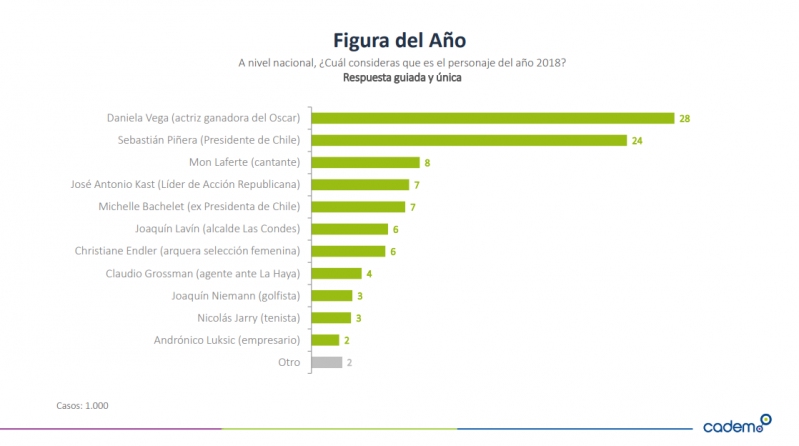 Sobre las figuras del 2018, para un 28% de los encuestados la personalidad más destacada del año fue Daniela Vega, quien además de haber ganado el Óscar por “Una mujer fantástica”, se convirtió en la primera transgénero en presentar en la ceremonia.