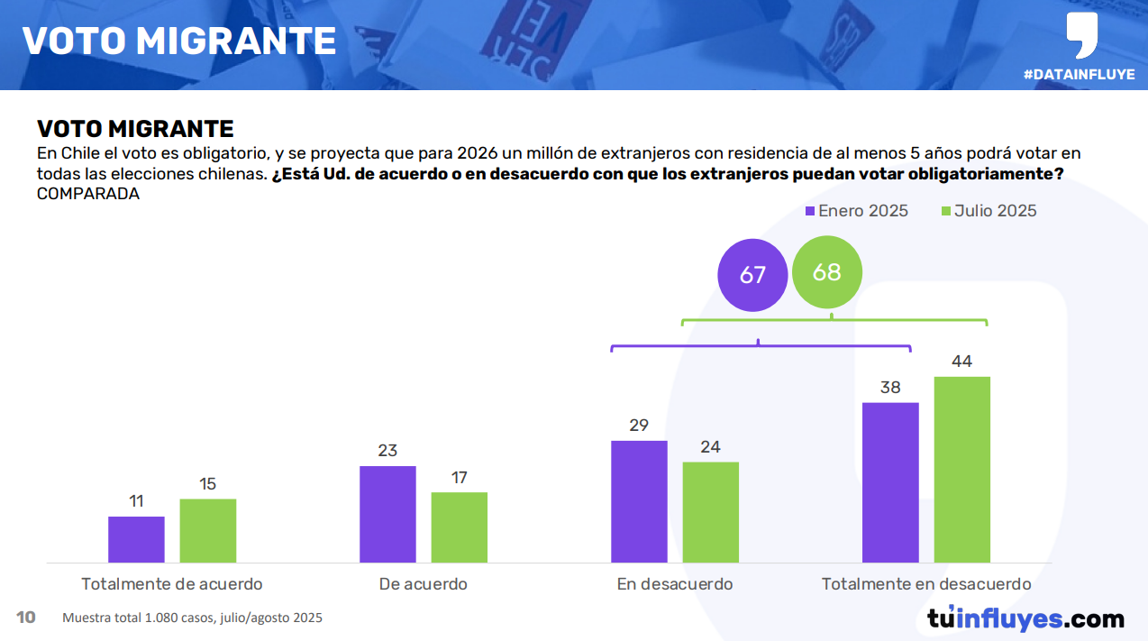 Considerando lo anterior, el estudio preguntó: "¿Está Ud. de acuerdo o en desacuerdo con que los extranjeros puedan votar obligatoriamente?”.