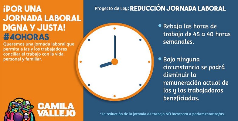 La Comisión de Trabajo acordó que desde la próxima semana comenzará la discusión del proyecto de ley que hace un año y medio presentó la diputada comunista Camila Vallejo, y que busca rebajar las horas de trabajo de 45 a 40 horas semanales.