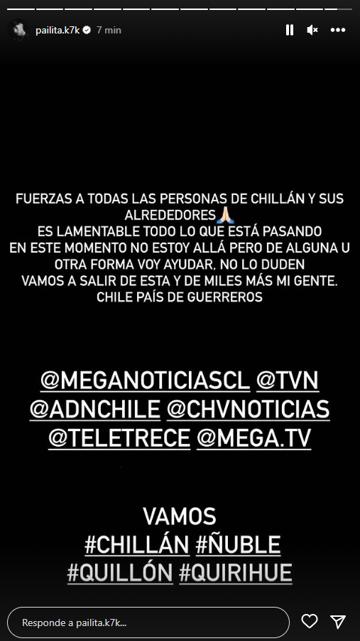 A través de sus stories de Instagram, el músico chileno, que por estos días se encuentran disfrutando de una vacaciones en México, envió "fuerza a todas las personas de Chillán y sus alrededores".